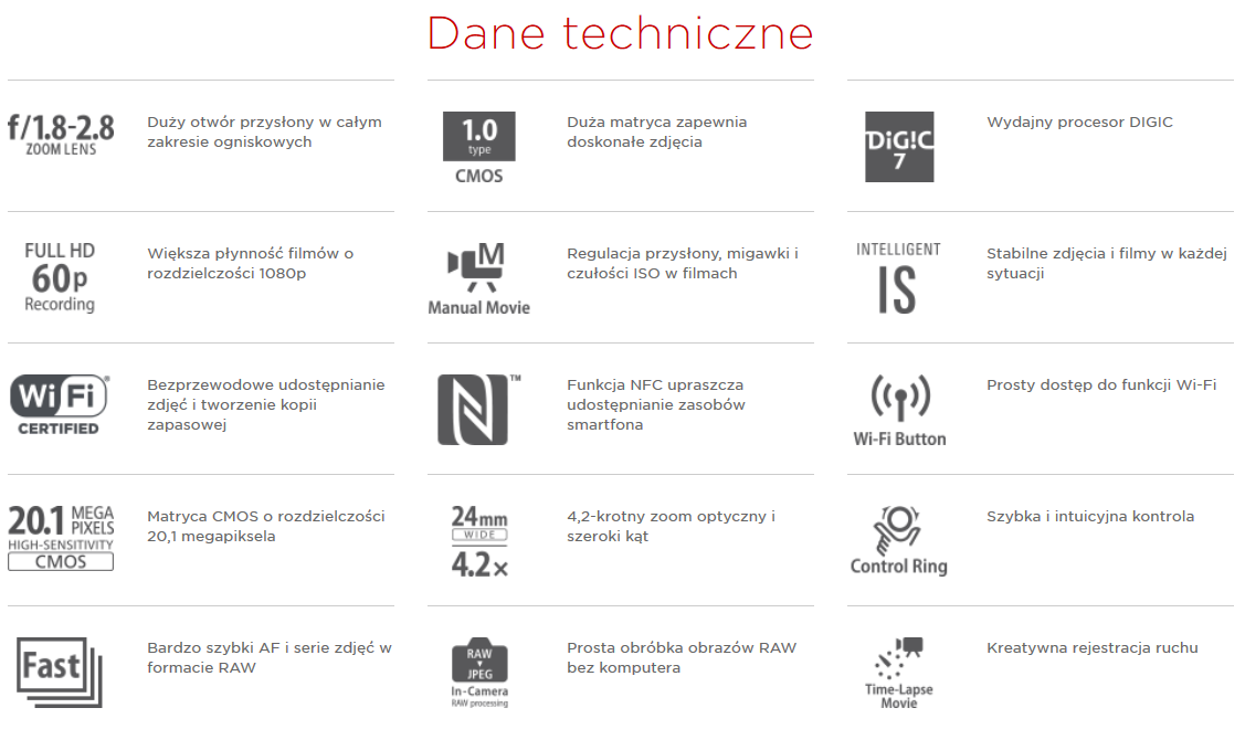 Dzięki matrycy o wielkości 1,0 cala, jasnemu obiektywowi (f/1,8-2,8) firmy Canon i doskonałemu procesorowi DIGIC 7 ten kieszonkowy aparat kompaktowy z dużą matrycą umożliwia kreatywną pracę typową dla lustrzanki w przypadku zdjęć i filmów Full HD.